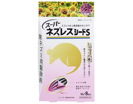 | 特徴 | ■ネズミの好む「ヒマワリの種」と「大豆油」を使用し、ネズミの食いつきを良くした薬剤です。 ■徐々に効果が現れるため、学習能力が高く、集団で生活する家ネズミ(特にクマネズミ)に警戒心を持たせません ■3~5日間、継続して同じネズミに食べさせることにより効果を発揮します。 発売元【レインボー薬品㈱】 |