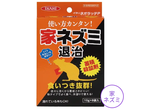 | 特徴 | ■喫食後3〜6(※平均値)時間で効果がでる急性殺鼠剤です。 ■袋(分包)のまま使用できるので、手を汚すことなく簡単です。 ■クマリン系の薬剤に抵抗性があるネズミにも効果を発揮します。 ■本剤を食べて死んだネズミを他の動物が食べても、中毒等の二次被害が起こりにくく、安全性に優れています。 発売元【イカリ消毒㈱】 |
