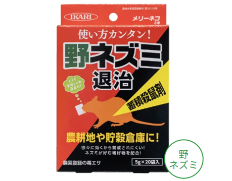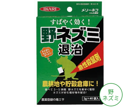 | 特徴 | ■農地や山林だけでなく貯穀倉庫でも使用可能な野ネズミ対策の殺鼠剤です。 ■喫食後、数時間で効果が表れる素早く効くタイプです。。 ■従来の急性毒エサに比べて食いつきは良好です。 ※注意!! 野ソ以外には使用しないでください。 発売元【イカリ消毒㈱】 |